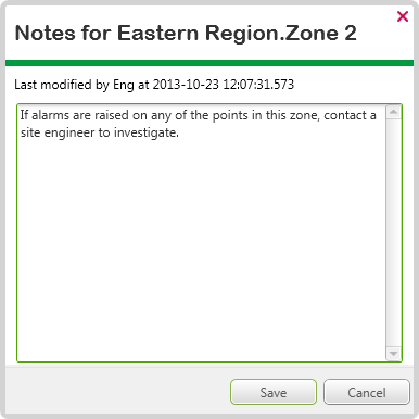 If your user account is assigned both the Read and Edit Notes permissions for the item, you can either view or modify any existing note, or add a note about the selected item or Group. For example, information about what to do if the item has an alarm.