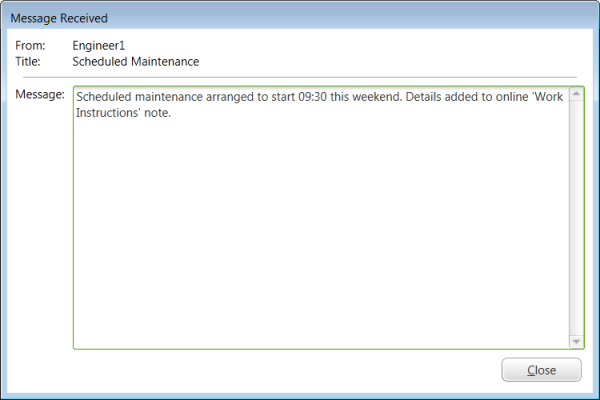 The message appears in a window on the ViewX client onto which the recipient is logged. (If the recipient is not logged on to a ViewX client, the sender is notified when they attempt to send the message to that user.)