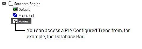 - Pre-Configured Trends—These are system-specific Trends that have been configured by high level users as part of your Geo SCADA Expert database configuration. They appear as Trend items in your database, enabling you to access them in the same way as other items such as Mimics: