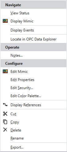 - If the item is included on a Mimic and its entry is configured to provide access to the Object menu, select that item’s entry on the Mimic (see Controlling Items via a Mimic).
