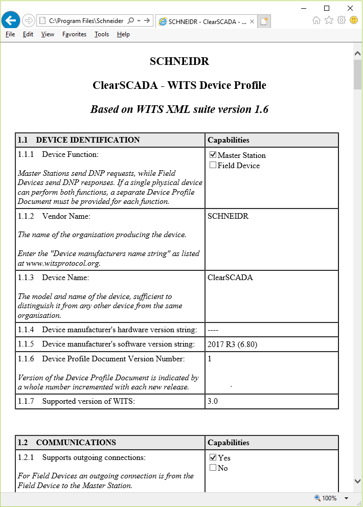 These device profiles contain details about the WITS features that Geo SCADA Expert supports; they are not the device profiles for field devices. Each Geo SCADA Expert device profile is an XML file that you can display in a web browser.
