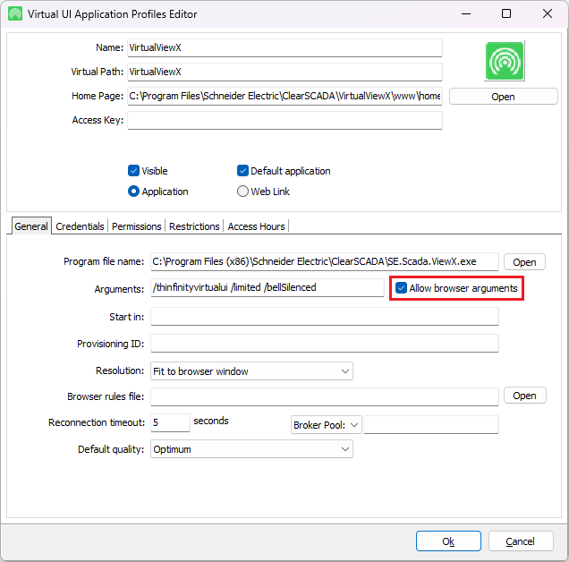 You can opt to include the URL to the relevant Alarm View on the Virtual ViewX server (rather than to the WebX server) in alarm redirection e-mails (see E-Mail Settings). To enable the Virtual ViewX URL to work, the Allow browser arguments check box has to be selected in the Virtual UI Server Tool. To check this: