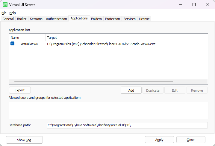 This tab shows the location at which the screen virtualization software is stored. We recommend that you do not alter the files at this location. This software is integrated with Virtual ViewX to provide web access to the Geo SCADA Expert database.