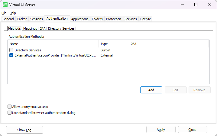 This tab shows the authentication method used for user access to Virtual ViewX.