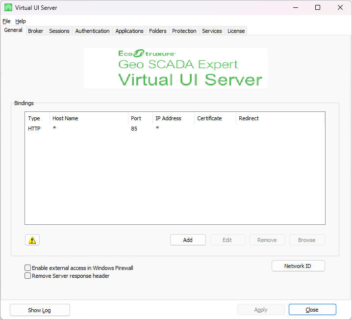 Changing the settings on the Virtual UI Server window that have not been specified underneath, without guidance from Schneider Electric support may result in the Virtual ViewX server being unable to run. It could also affect system security. Only alter such settings when advised to do so in this topic or by Schneider Electric support.