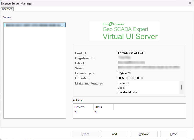If you select the Manage button on this tab, you are presented with a window that provides further details about the Virtual ViewX license. This includes the number of ViewX servers and Virtual ViewX client users that the license supports. In the Activity field, you can also see the number of licenses that are currently in use for this particular Virtual ViewX server.
