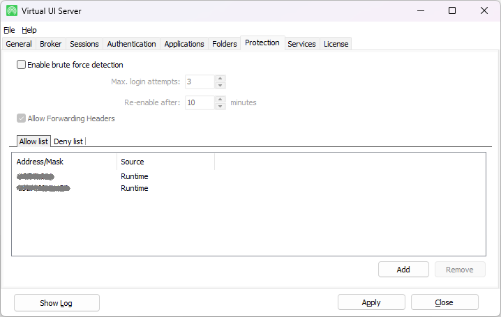 Since Virtual ViewX is served through an IIS proxy, you can only use the Allow list and Deny list in the Virtual UI Server window to prevent access to the localhost port 6580 (or 85).