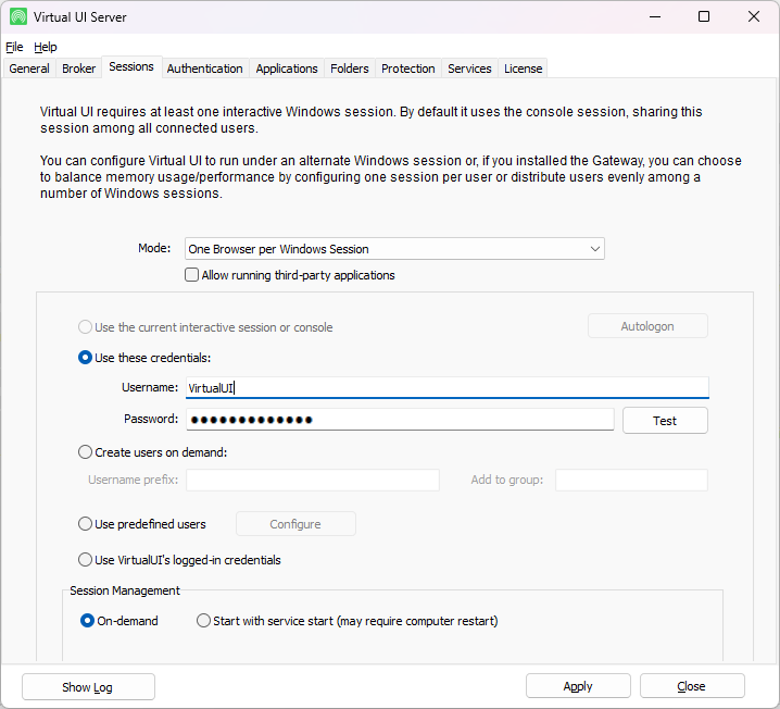 This tab indicates whether the Virtual ViewX session uses the default console session, or runs under an alternative Windows account. When Virtual ViewX is installed on a Windows Server Operating System, a user in the Remote Desktop group will be created and added here during the installation process. If the Virtual ViewX server is to provide access to Geo SCADA Expert from multiple client accounts, use one of the following configurations:
