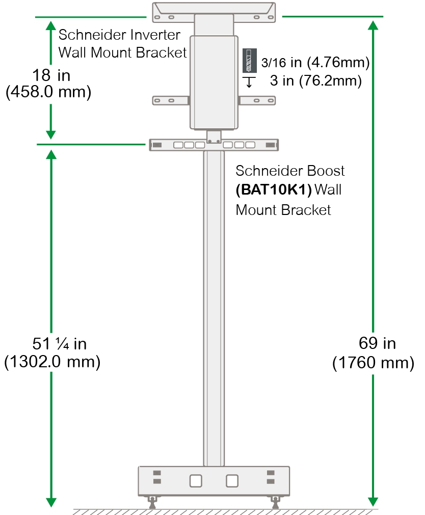 Install the wall mount bracket(s) as shown below. Dimensions shown are from the floor to the mounting slots. IMPORTANT: If you are installing a Schneider Boost battery with the inverter, the battery must be installed first.