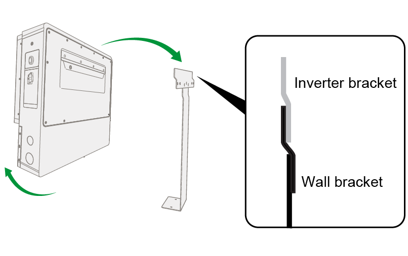 Tilt the inverter until the inverter's bracket is behind the wall mount bracket. Then slide the inverter down until the brackets are as shown below.