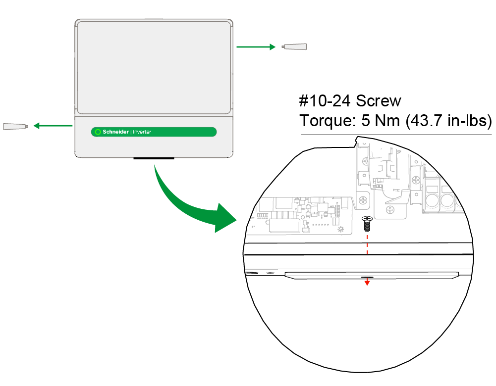 Remove handles from the inverter and then install a #10-24 screw to attach the bracket to the bottom of the inverter, as shown below. Torque to 5 Nm (43.7 in-lbs).